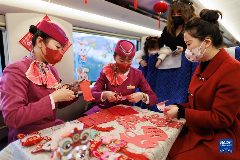 1月13日,C5980次列車(chē)乘務(wù)員在和旅客一起剪紙。
