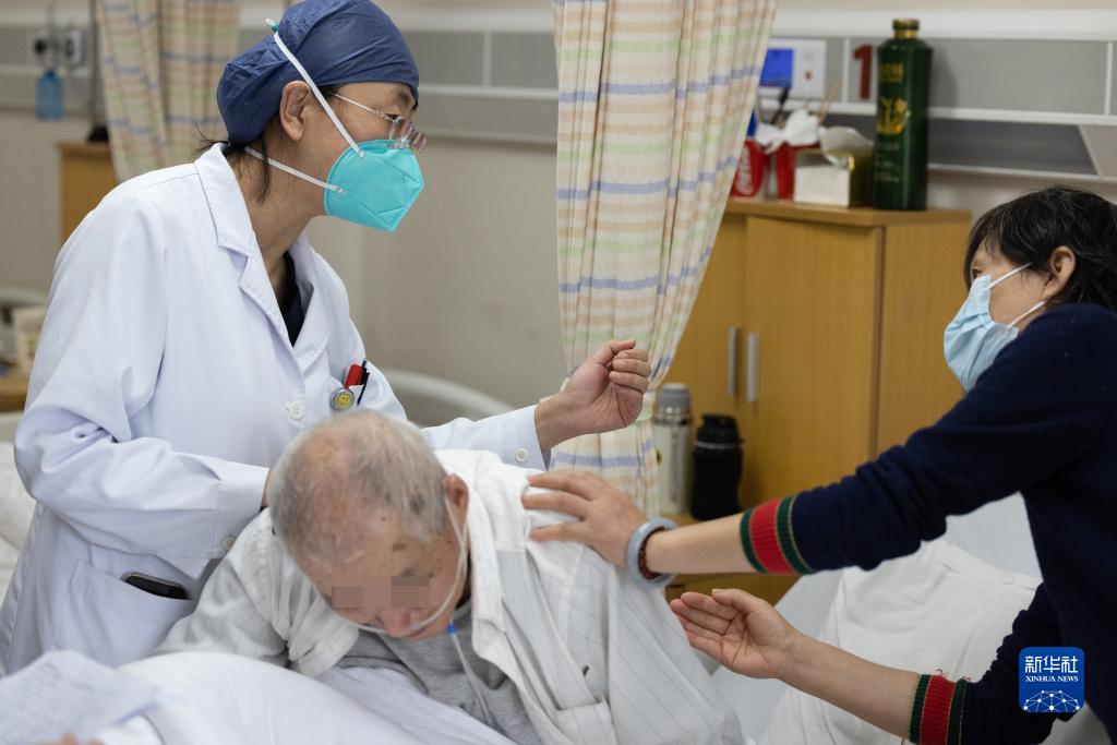 1月12日,在復旦大學(xué)附屬華山醫院虹橋院區,感染科主任醫師李寧指導家屬給患者拍背幫助排痰。