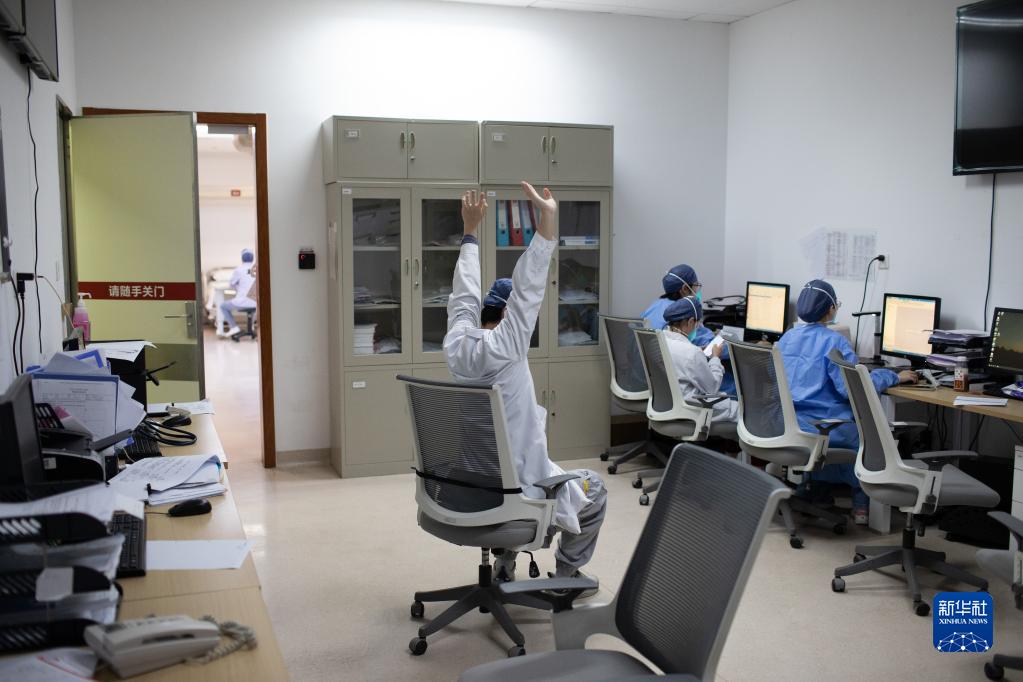 1月12日,在復旦大學(xué)附屬華山醫院虹橋院區急診搶救室醫生辦公室,一名醫生(左)在放松身體。