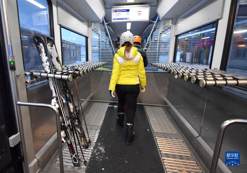 這是1月12日在瑞士少女峰拍攝的帶有滑雪板放置裝置的火車(chē)車(chē)廂。