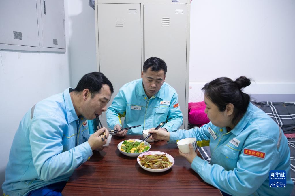1月12日,在北極村加油站員工宿舍內,吳金鳳(右)、沙德輝(中)和林德彬在吃晚飯。