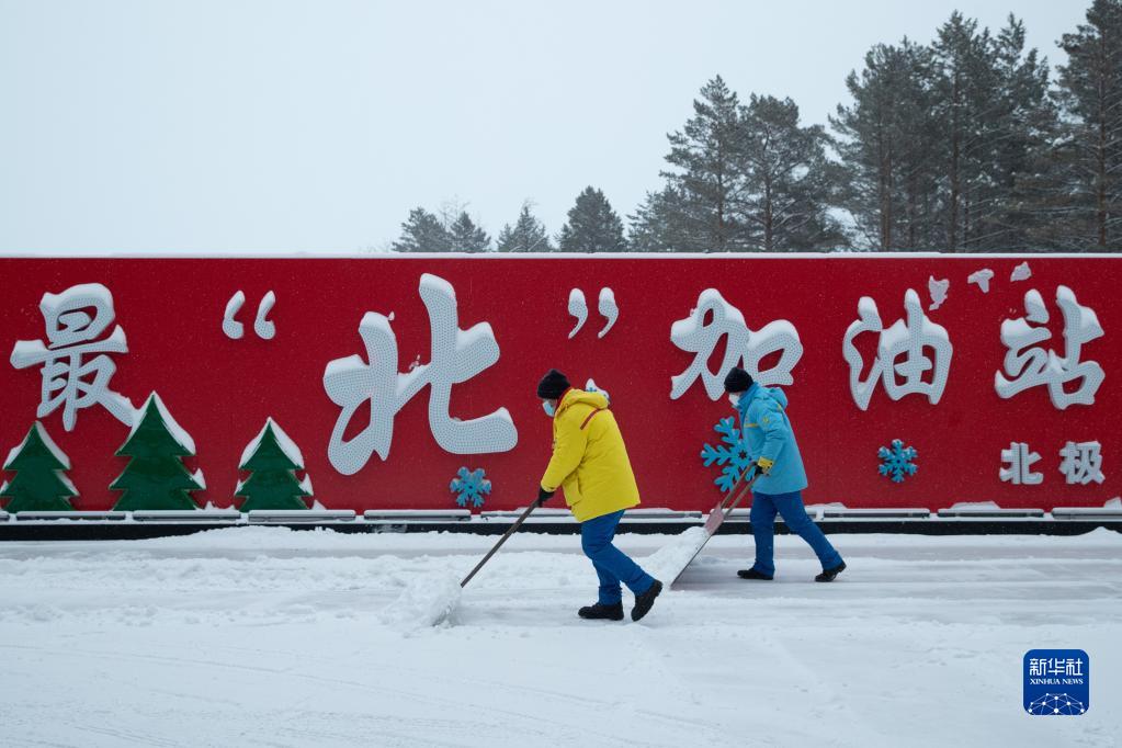 1月12日,在北極村加油站內,工作人員沙德輝(左)和林德彬在清理積雪。