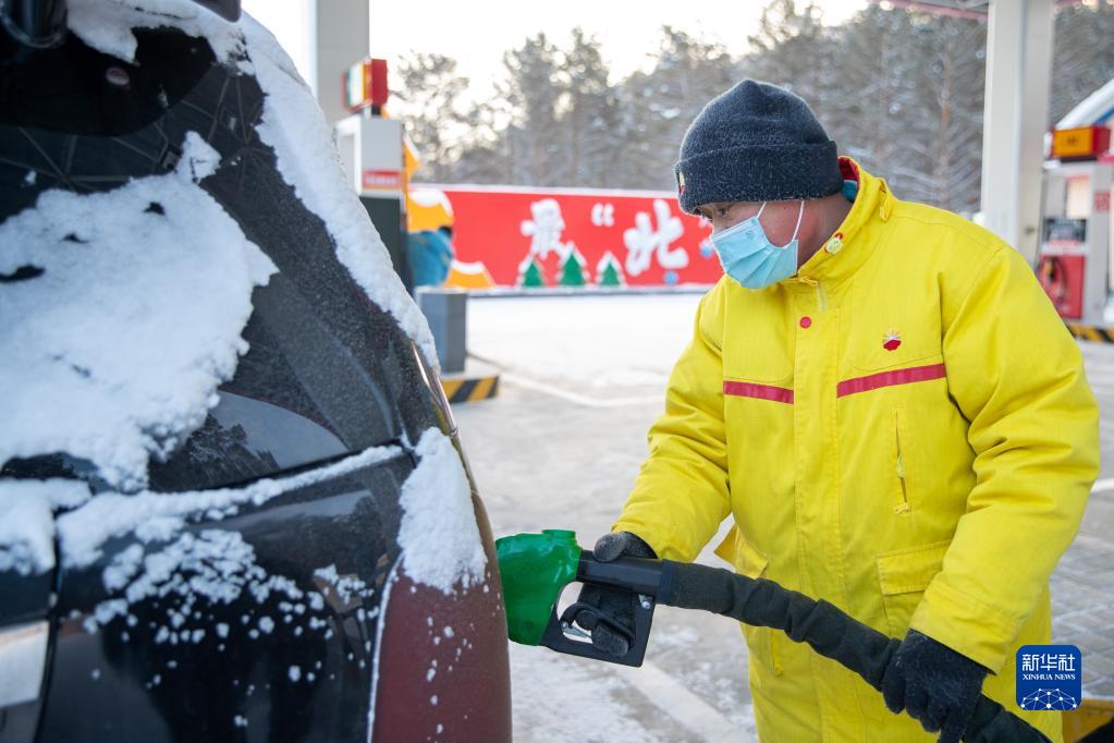 1月13日,在北極村加油站內,工作人員沙德輝在給汽車(chē)加油。