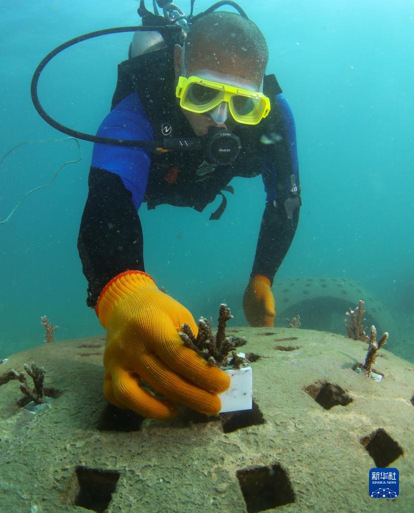 在海南省三亞市亞龍灣相關(guān)海域,潛水員在向人工生態(tài)珊瑚礁礁體上移植珊瑚(2022年11月16日攝)。