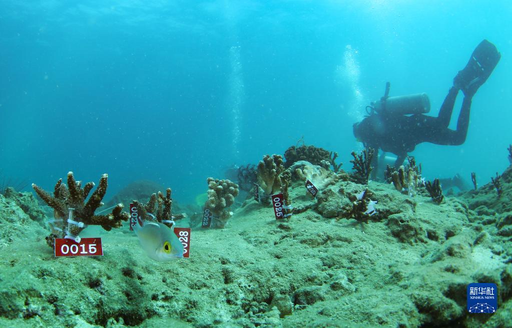 這是在海南省三亞市亞龍灣相關(guān)海域完成移植的部分珊瑚(2022年11月17日攝)。