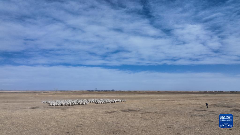 1月12日,牧民在青海省海北藏族自治州剛察縣泉吉鄉放牧(無(wú)人機照片)。