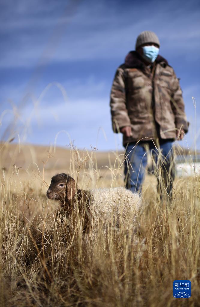 1月12日,在青海省海北藏族自治州剛察縣伊克烏蘭鄉剛察貢麻村,一只剛出生不久的羊羔在牧民吉科加的冬季草場(chǎng)上。