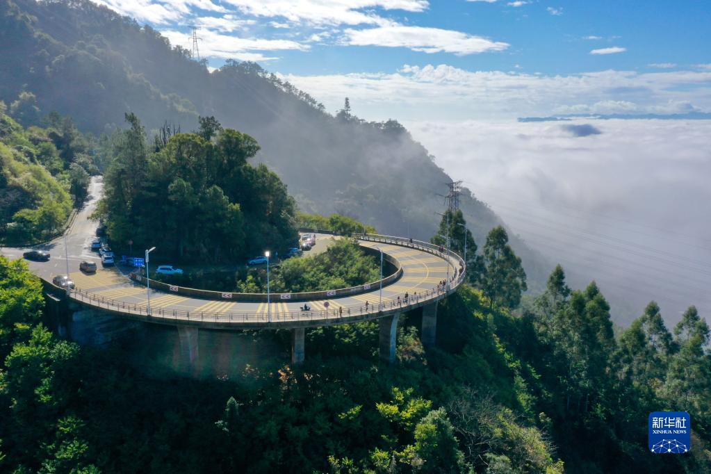 1月14日,游客在福州鼓嶺觀(guān)景平臺欣賞平流霧景觀(guān)(無(wú)人機照片)。