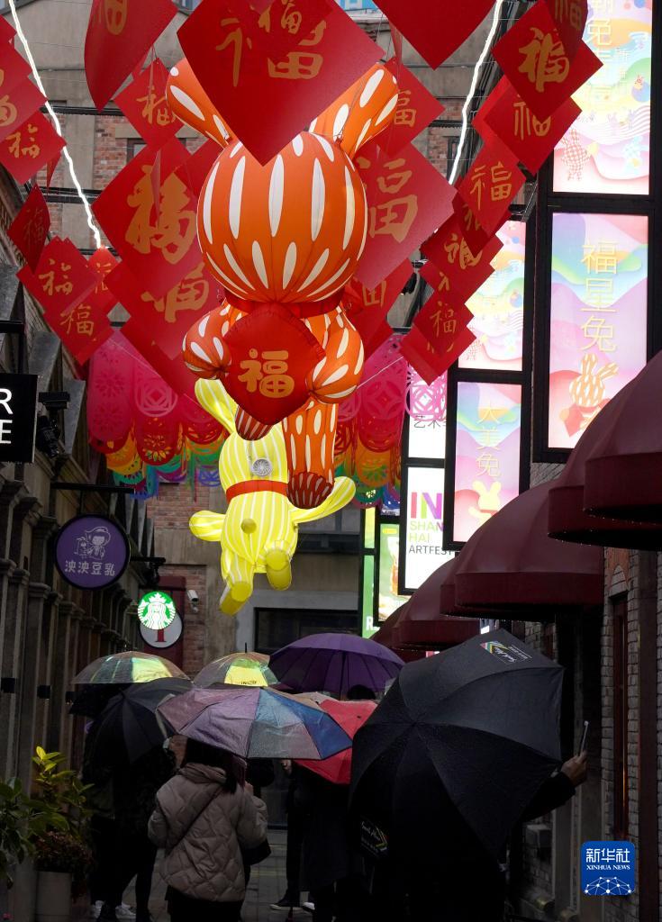 1月13日,人們漫步在“福星兔”彩燈裝扮的弄堂中。
