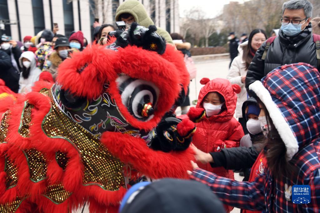 1月14日,在海淀北部文化中心外,人們在觀(guān)看舞獅。