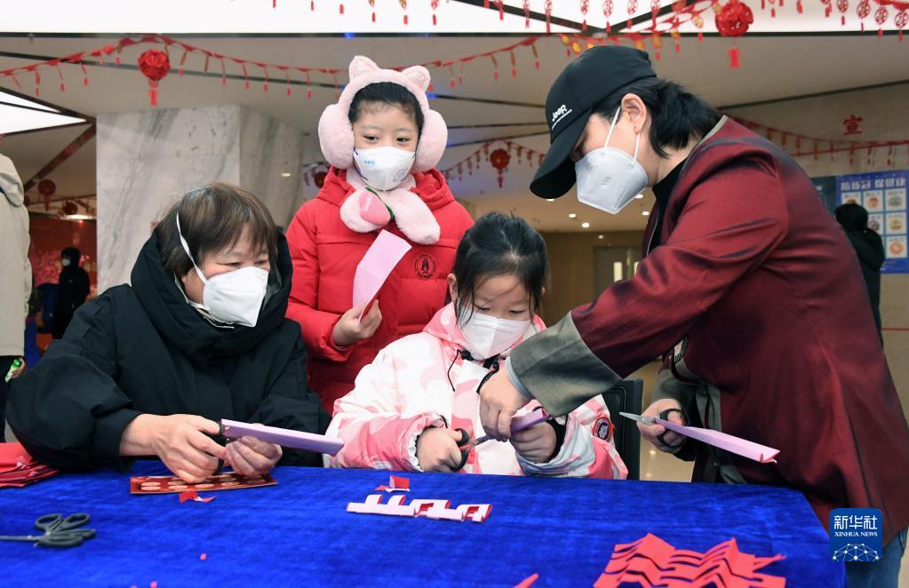 1月14日,在海淀北部文化中心,小朋友在學(xué)習剪紙。