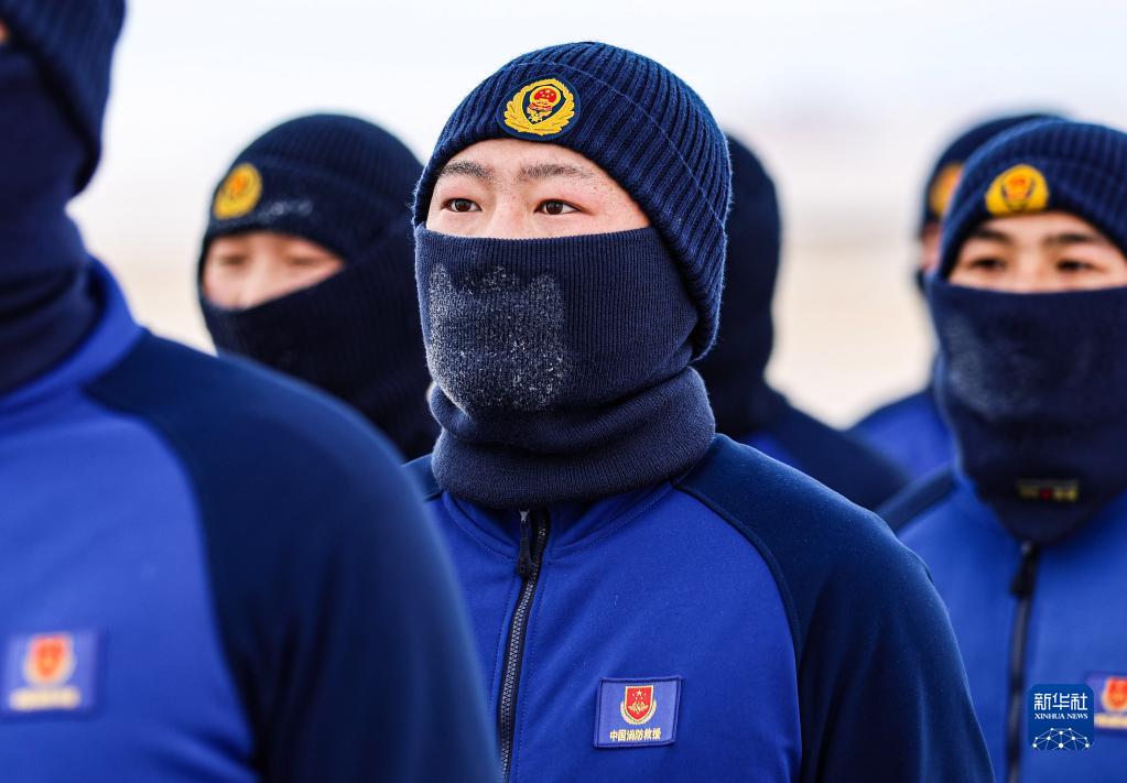 1月7日,訓練中的西烏珠穆沁旗消防救援大隊消防員的防寒面罩上結上了霜。