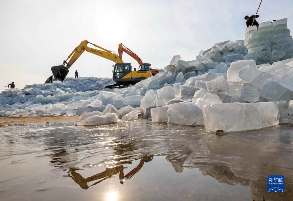 1月14日,河北省唐山市豐南區黑沿子鎮的農民在整理碼放采集的冰塊。