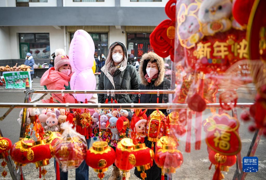 1月14日,人們在賀蘭縣金貴大集上選購春節飾品。
