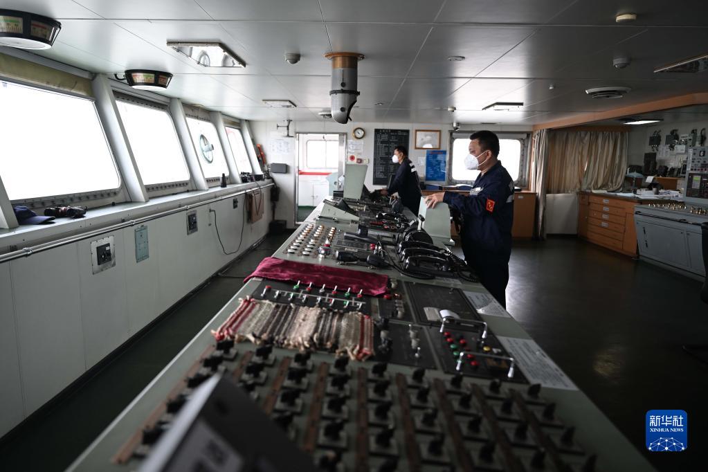 劉昱在粵海鐵路輪渡駕駛臺操舵(1月8日攝)。