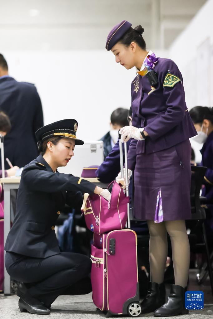 1月14日,在鐵路上??瓦\段高鐵值班室,毛靜(左)為毛雯整理乘務(wù)箱。