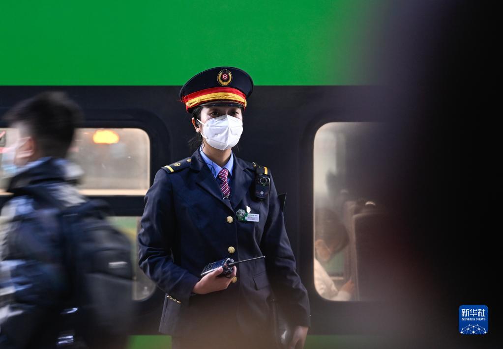 1月11日,在成都火車(chē)南站,阿依布卡在站臺上迎接旅客上車(chē)。