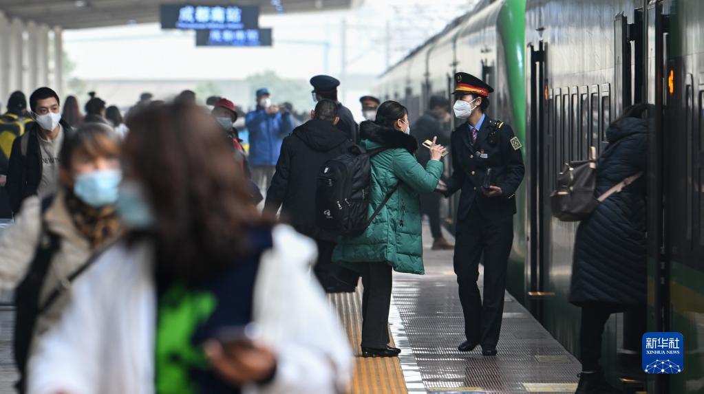 1月11日,在成都火車(chē)南站,一位旅客詢(xún)問(wèn)阿依布卡(右二)車(chē)廂位置。