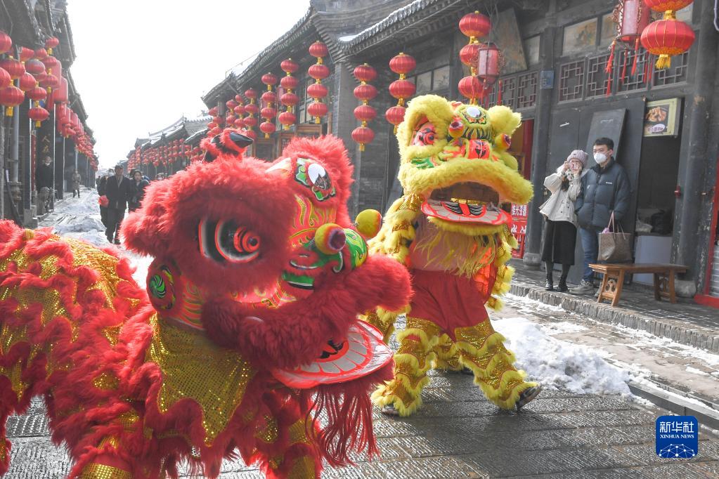 1月14日,民間藝人在山西平遙古城內表演舞獅。