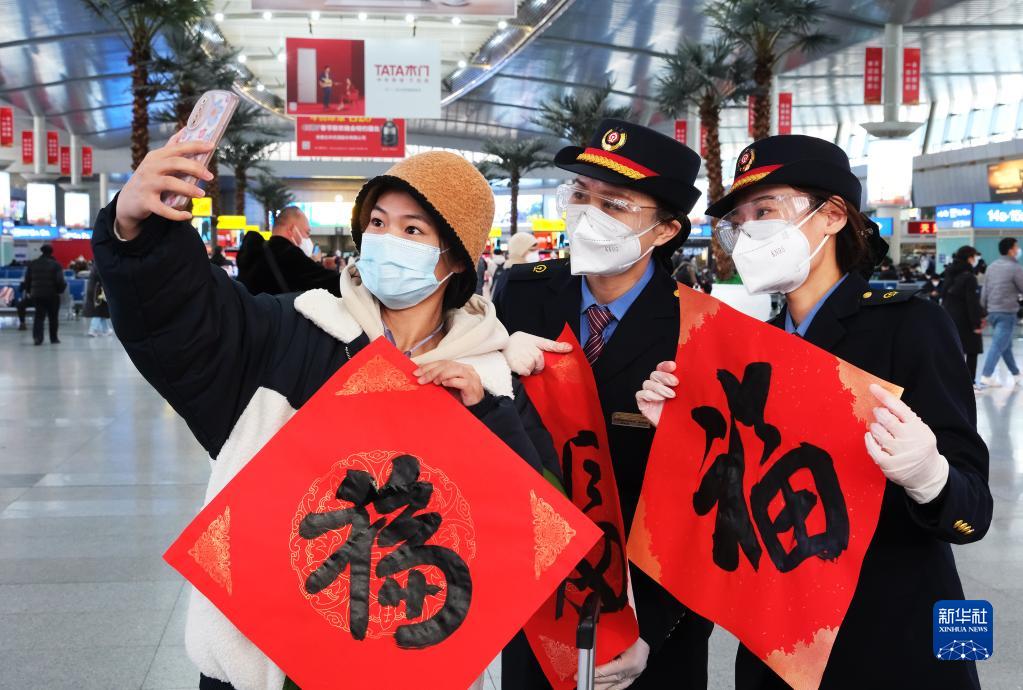 1月14日,在天津站候車(chē)大廳,乘車(chē)回家的旅客與車(chē)站工作人員用手機拍照留念。