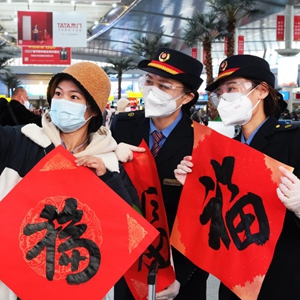 當日正值北方小年,一場(chǎng)“送萬(wàn)福、進(jìn)萬(wàn)家”書(shū)法公益活動(dòng)在天津站候車(chē)大廳舉行。多名書(shū)法家現場(chǎng)書(shū)寫(xiě)福字和春聯(lián),由車(chē)站工作人員送給旅客,送上濃濃的祝福。新華社發(fā)(楊寶森 攝)