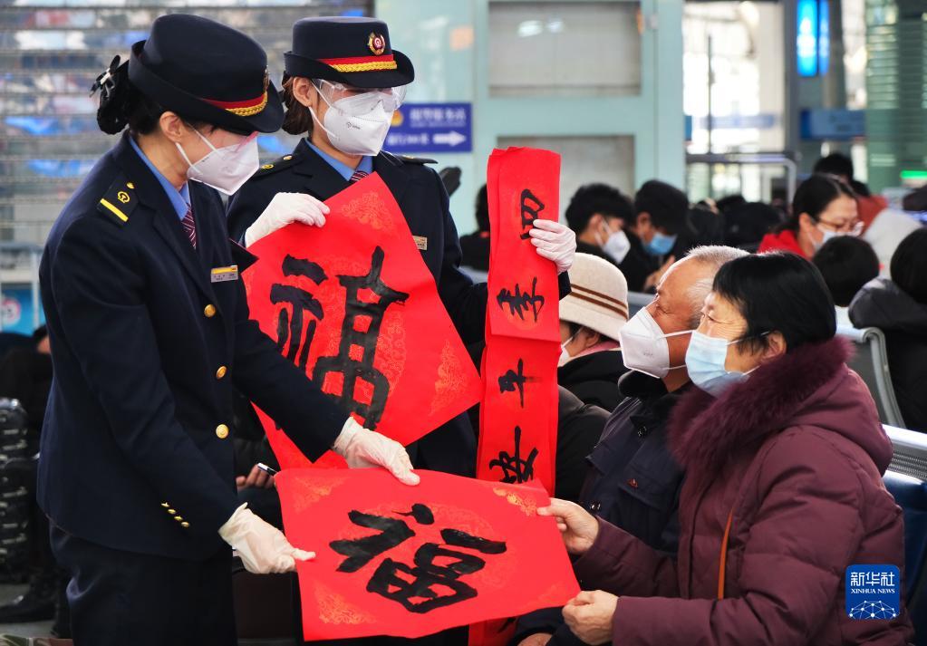 1月14日,天津站工作人員在候車(chē)大廳為旅客送上春聯(lián)、福字。