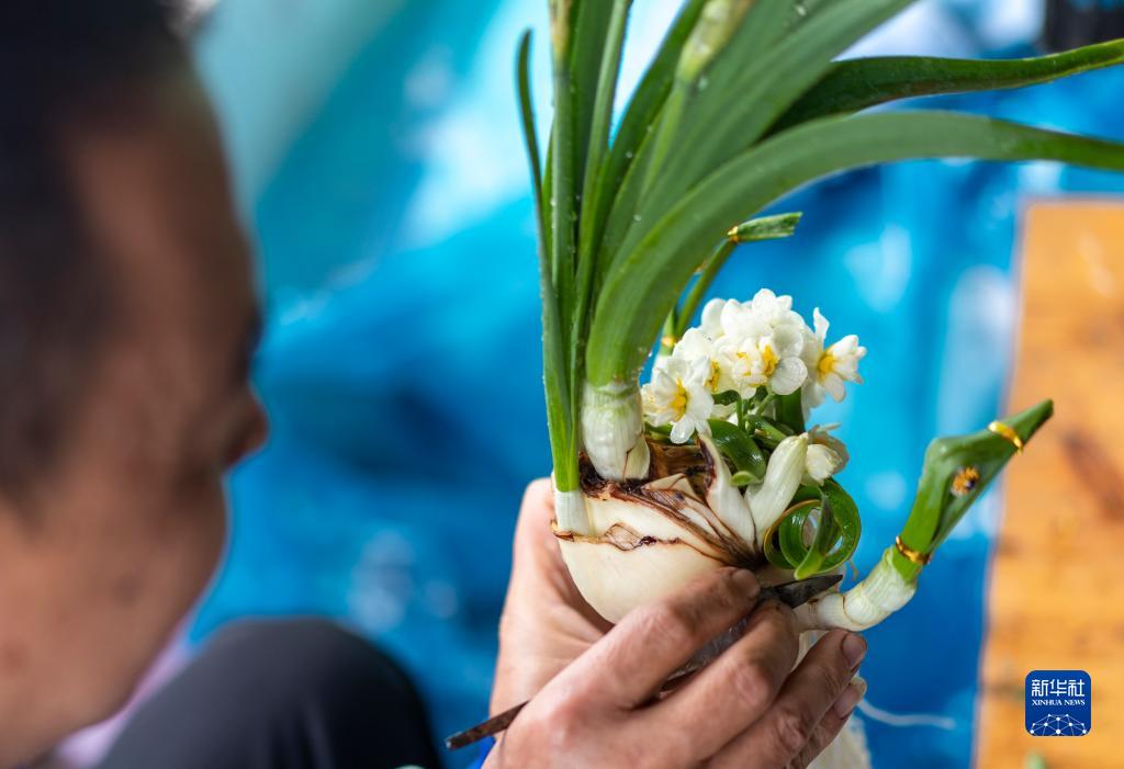 多年來(lái),福建漳州花農探索出種球閹割、三年復種的水仙種植技術(shù),收獲鱗莖碩大、花苞較多的花球。一顆飽滿(mǎn)的水仙花球要通過(guò)雕刻師開(kāi)蓋、疏隙、削葉等雕刻步驟初步成形,經(jīng)過(guò)一個(gè)月左右的養護,再加以創(chuàng )意雕琢,塑造出各式各樣的水仙花雕藝盆景,為新春佳節增添一抹詩(shī)情畫(huà)意。新華社發(fā)(張旭 攝)