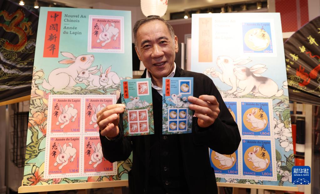 1月14日,在法國巴黎舉行的兔年生肖郵票發(fā)行儀式上,郵票設計者陳江洪展示兔年生肖紀念郵票。