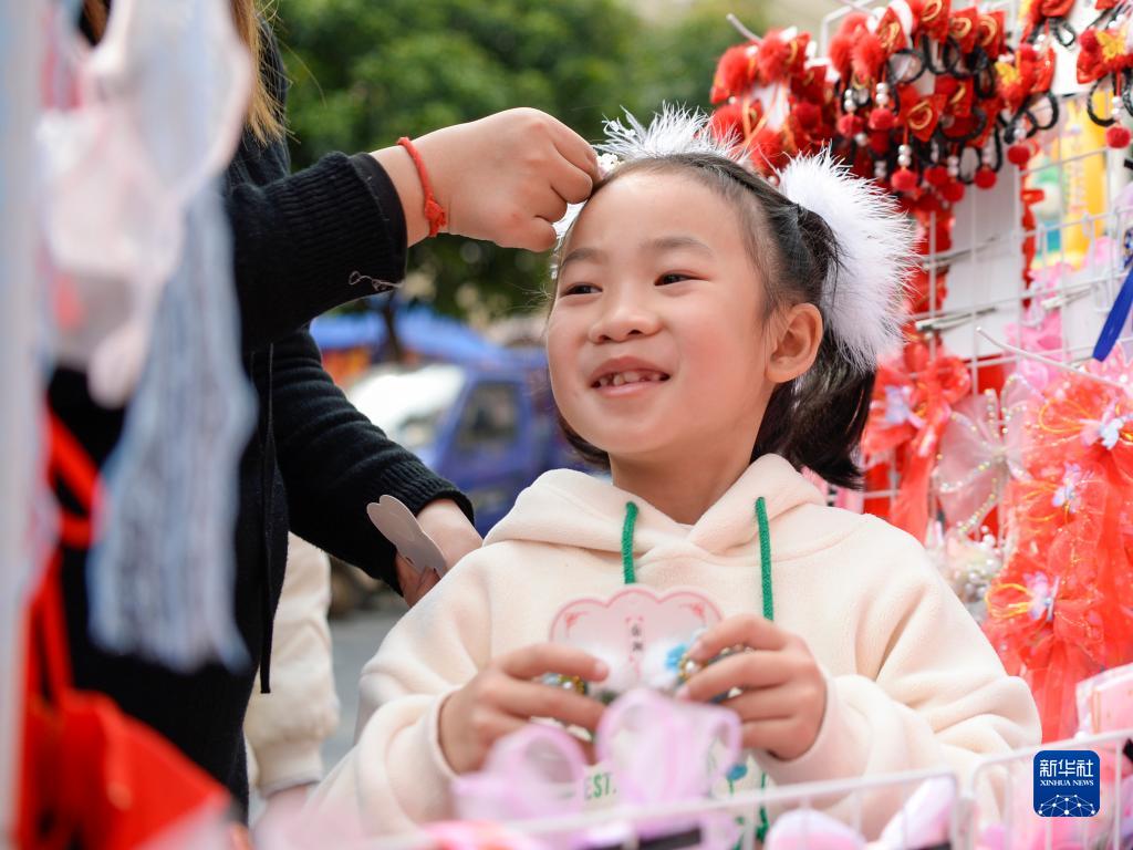 1月14日,小朋友在貴州省黔南布依族苗族自治州羅甸縣的年貨市場(chǎng)上選購飾品。