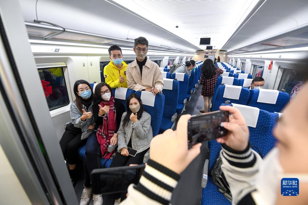 1月15日,在深圳北站,搭乘恢復通車(chē)后內地駛往香港首趟列車(chē)G5607次的乘客在車(chē)廂里留影。