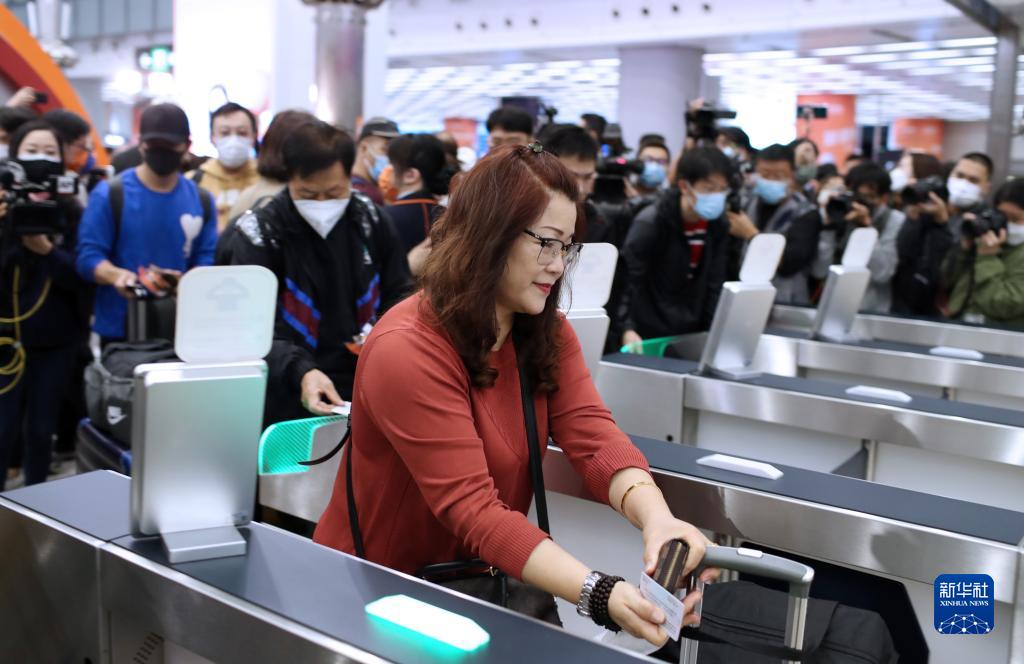 1月15日,在香港西九龍站,旅客過(guò)閘口,準備搭乘恢復通車(chē)后香港發(fā)出的首趟列車(chē)G5624次。