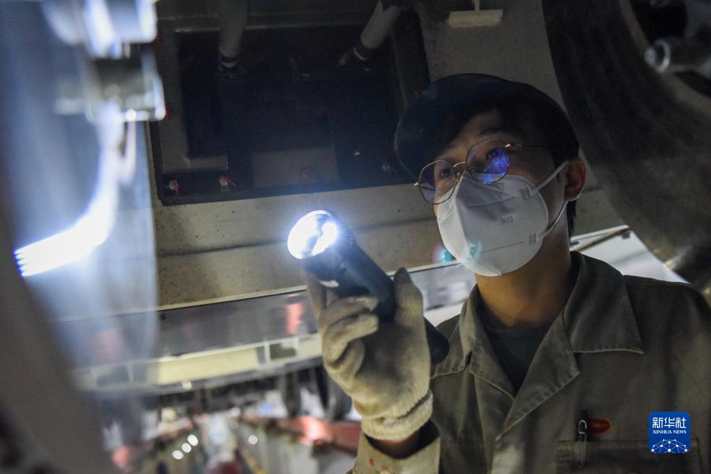 1月14日北方小年夜,烏魯木齊車(chē)輛段動(dòng)車(chē)組運用所檢修庫內燈火通明,白天馳騁天山南北的動(dòng)車(chē)在這里集結,一群青年機械師在連夜進(jìn)行檢查、測試、維修工作,以保障動(dòng)車(chē)運行安全。