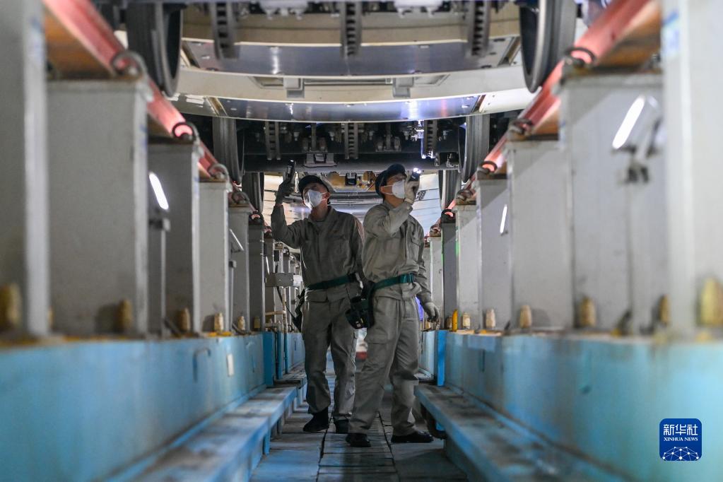 1月14日晚,在烏魯木齊車(chē)輛段動(dòng)車(chē)組運用所,機械師對動(dòng)車(chē)組車(chē)底進(jìn)行檢查。