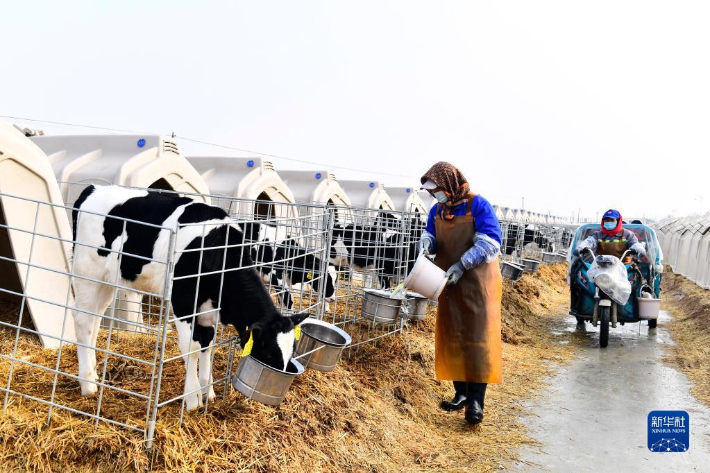 1月15日,在衛崗乳業(yè)日照鮮純生態(tài)牧業(yè)有限公司,工作人員為犢牛添加營(yíng)養水。