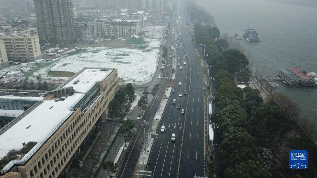 1月15日,在長(cháng)沙市天心區湘江中路,車(chē)輛在雪中行駛(無(wú)人機照片)。