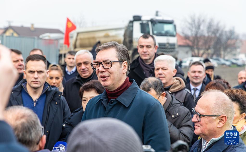 1月14日,塞爾維亞總統武契奇(前中)在塞北部城市諾維薩德附近視察匈塞鐵路諾維薩德至蘇博蒂察邊境段建設工地。