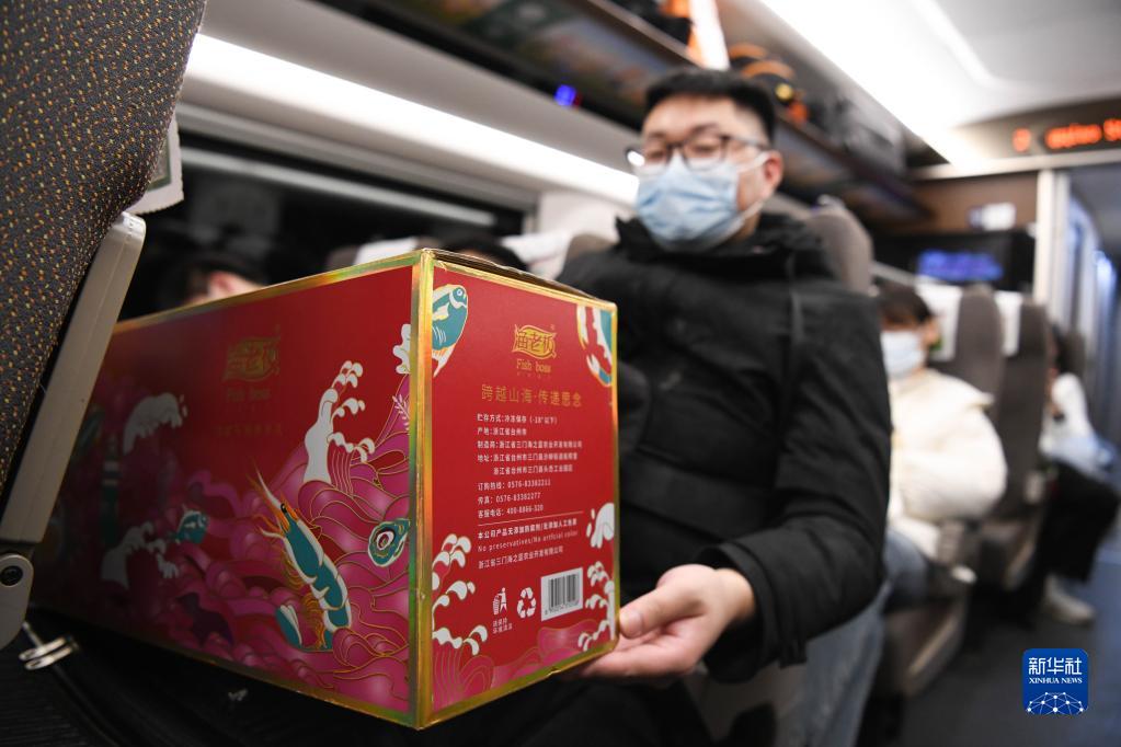 1月14日凌晨,在上海虹橋開(kāi)往亳州南的G9480次高鐵列車(chē)上,一名旅客展示自己要帶回家的年貨。