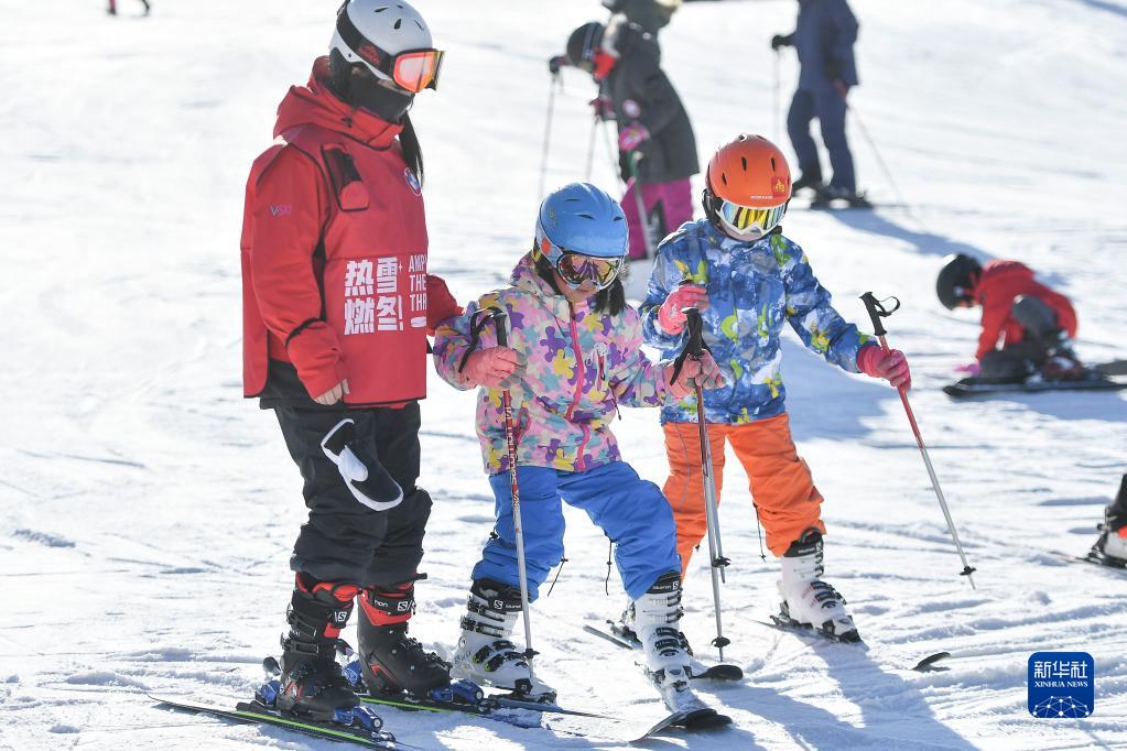 1月15日,小朋友們在教練的指導下學(xué)習滑雪。