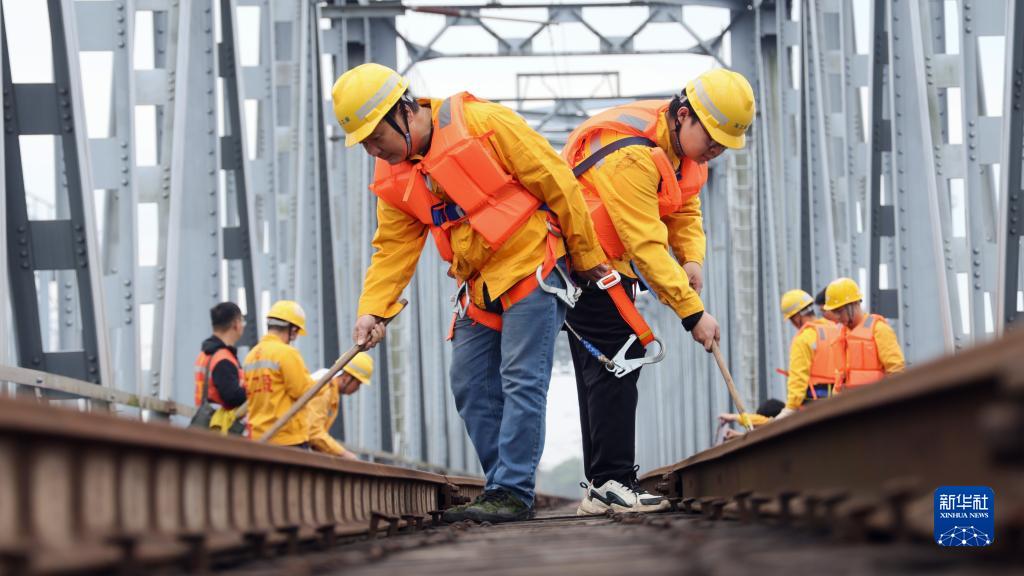 1月14日,在廣西貴港市,陳榮興(前左)、陳龍(前右)和工友們在巡查鐵路郁江橋橋面鋼軌。