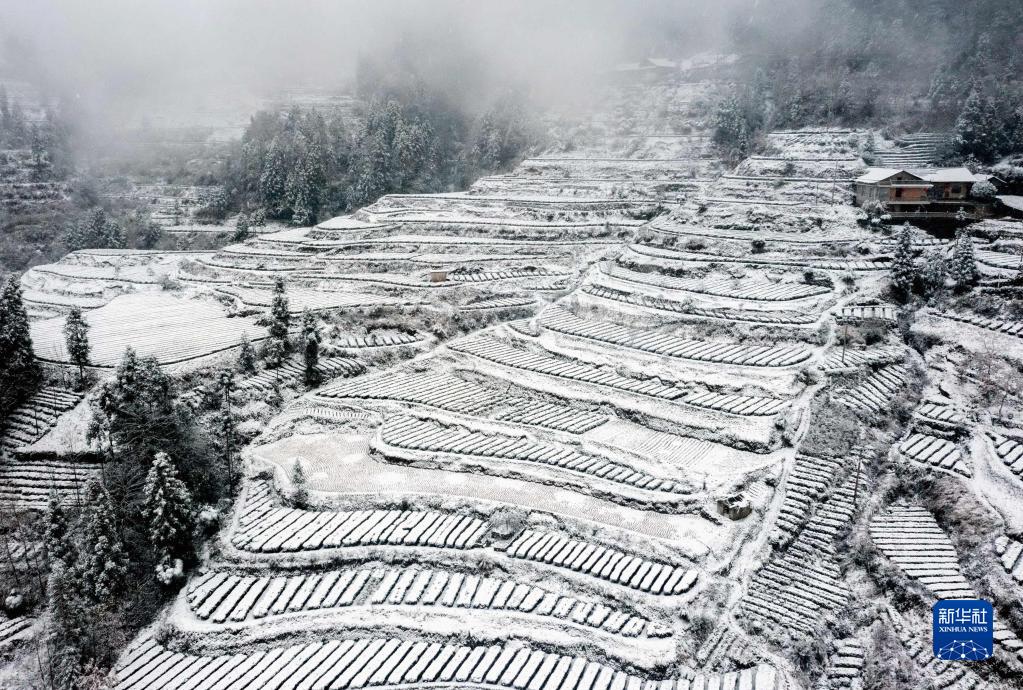 這是1月15日在湖北省宣恩縣珠山鎮和平社區拍攝的被冰雪覆蓋的茶園梯田(無(wú)人機照片)。