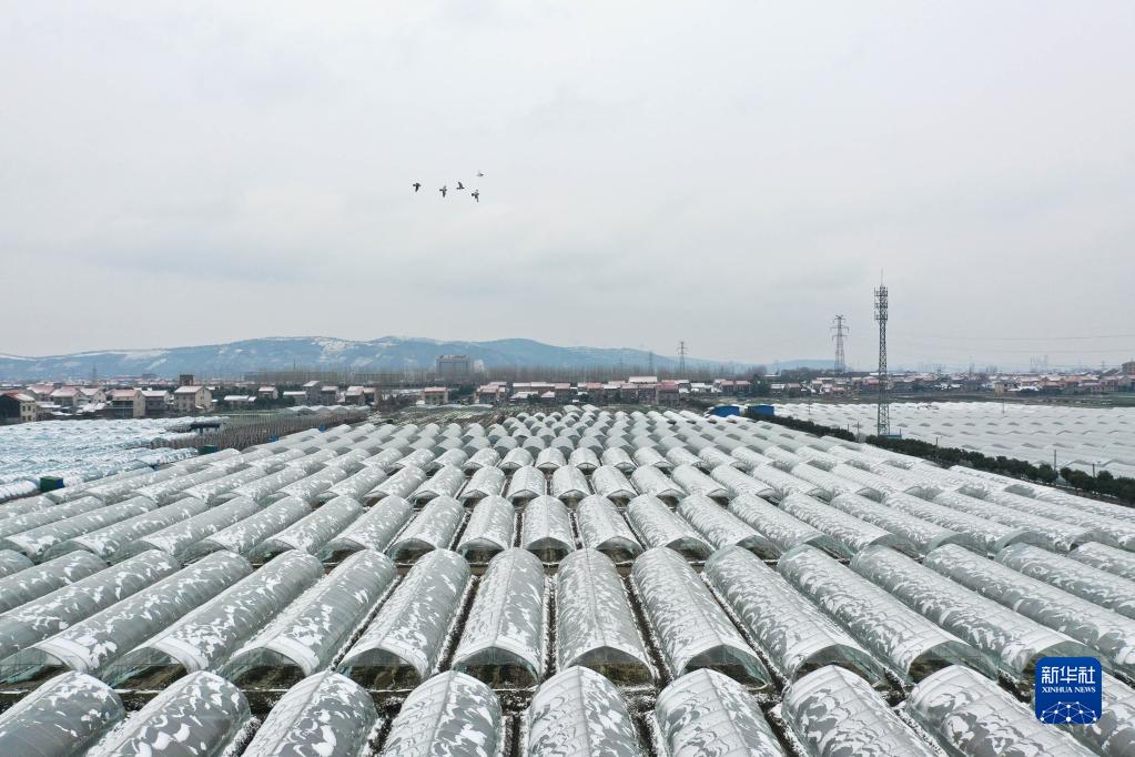 1月15日,湖南省常德市澧縣澧澹街道鄧家灘村的蔬菜大棚上覆蓋著(zhù)白雪(無(wú)人機照片)。