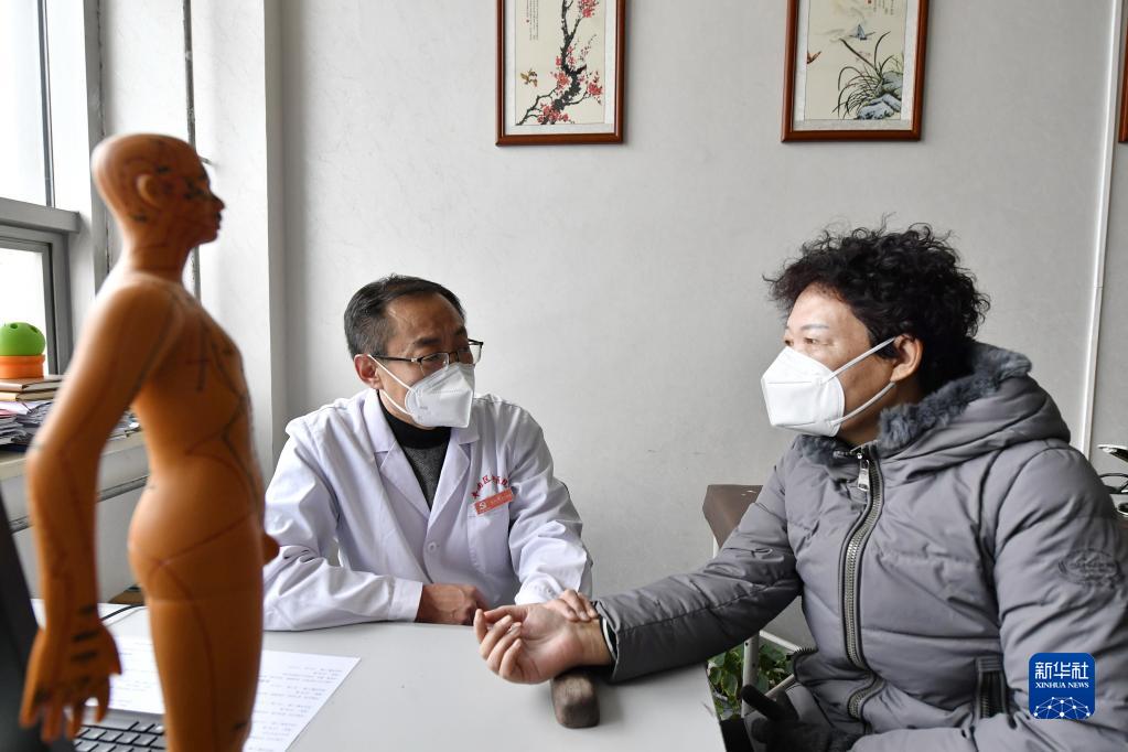1月15日,唐山市豐南區中醫院醫師劉化峰(左)在為患者號脈。