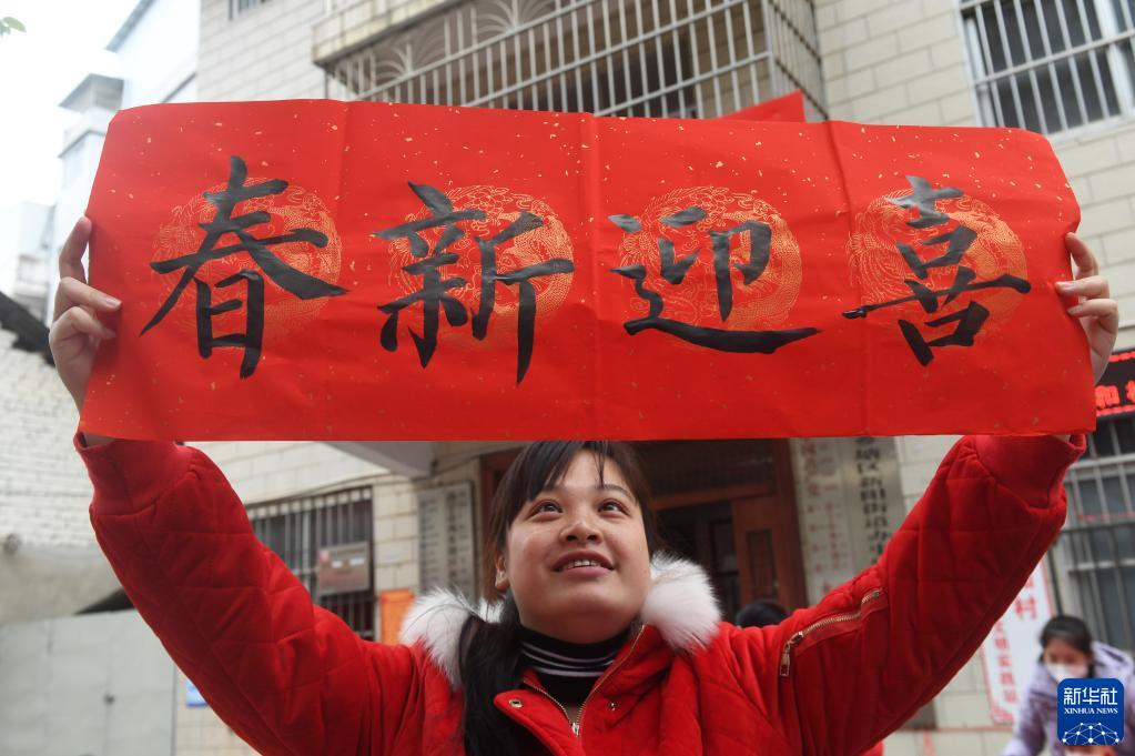 1月16日,在廣西南寧市西鄉塘區新陽(yáng)街道永和村,一名村民在展示一副春聯(lián)的橫批。