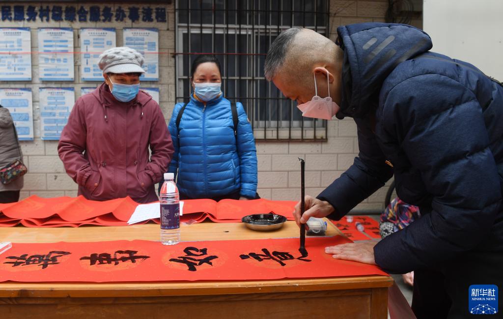 1月16日,在廣西南寧市西鄉塘區新陽(yáng)街道永和村,書(shū)法愛(ài)好者在為群眾寫(xiě)春聯(lián)。