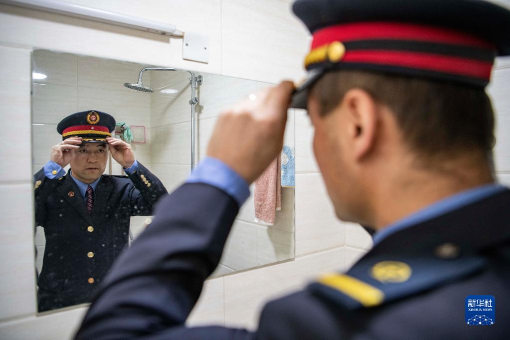 在拉薩機輛整備中心的宿舍里,黃起崗整理自己的著(zhù)裝(1月11日攝)。