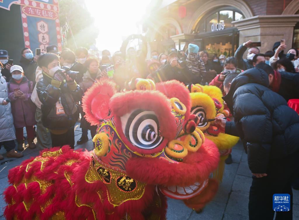1月16日,在新登鎮宋韻文化特色街區,人們給舞獅隊的獅子點(diǎn)睛。
