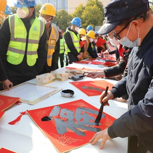 1月16日,安徽省文聯(lián)文藝志愿服務(wù)隊來(lái)到中鐵四局合肥新橋機場(chǎng)S1線(xiàn)先行段項目工地,為一線(xiàn)建設者寫(xiě)春聯(lián)、送福字。