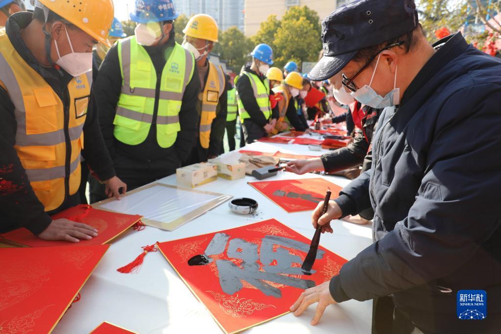 1月16日,安徽省文聯(lián)文藝志愿服務(wù)隊來(lái)到中鐵四局合肥新橋機場(chǎng)S1線(xiàn)先行段項目工地,為一線(xiàn)建設者寫(xiě)春聯(lián)、送福字。