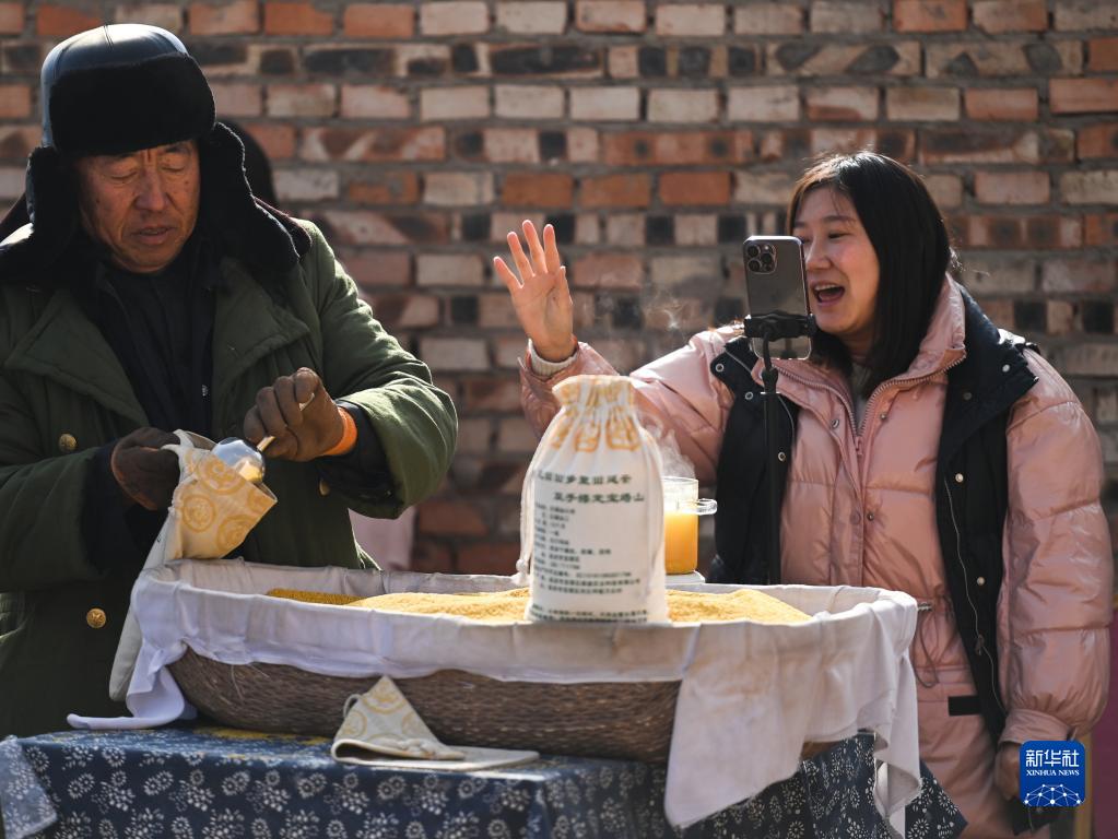 1月15日,在陜西延安寶塔區河莊坪鎮萬(wàn)莊村,一家農業(yè)科技有限公司的主播(右)在直播帶貨。