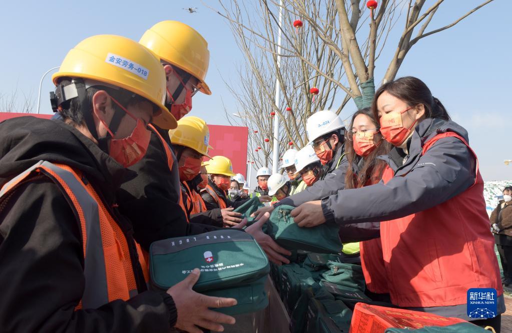 1月16日,志愿者為即將返鄉的中建四局六公司的工人發(fā)放防疫愛(ài)心包。